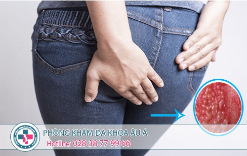 → Vùng hậu môn nóng rát, xuất hiện các vết loét đỏ xung quanh, rìa hậu môn và vùng quanh hậu lỗ hậu môn xuất hiện mụn nước mọc lẻ, kết thành chùm chứa mủ bên trong, đau nhức, ngứa ngáy và ẩm ướt khi mụn nước vỡ ra.