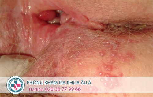 Biểu hiện: Nổi những mụn đỏ tại khu vực âm đạo, môi lớn, môi bé, dương vật, bìu, xung quanh vùng hậu môn. Trong những nốt mụn này thường hình thành những dịch lỏng, vài ngày sau xuất hiện dịch mủ, mụn vỡ ra gây lở loét, chảy máu khiến người bệnh đau đớn vô cùng.