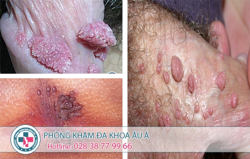 Biểu hiện: Nổi những nốt mụn li ti có màu hồng nhạt hoặc màu trắng ở khu vực quanh hậu môn, dương vật, âm hộ, niệu đạo... Lâu ngày các nốt mụn phát triển lớn hơn lan ra có hình dạng như súp lơ, dùng tay ấn vào đầu mủ chảy dịch vàng gây ngứa rát.