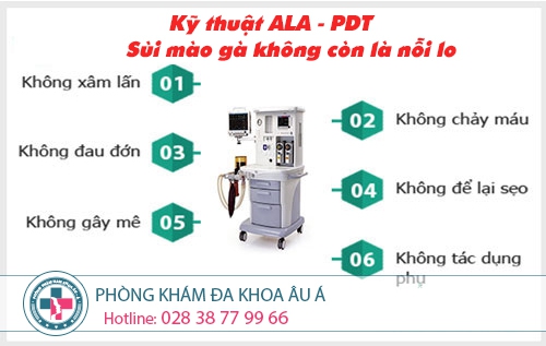 Ứng dụng phương pháp đốt điện để điều trị sùi mào gà: Các bác sĩ dùng một chất cảm quang đặc biệt, chiếu xạ vào vùng mụn dương vật do sùi mào gà, kích hoạt phản ứng quang đông rụng nối sùi đi mà không làm tổn hại các mô xung quanh. Đồng thời, tái tạo và phục hồi chức năng vùng tổn thương.